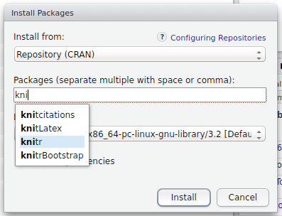 Para instalar el paquete knitr desde la terminal de R ejecutamos el siguiente comando.